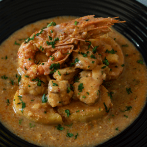 La merluza, uno de los pescados más versátiles y saludables, se fusiona a la perfección con la textura y sabor de los gambones frescos. Acompañada de unas patatas tiernas cocinadas con vino blanco y caldo de pescado, esta receta es un auténtico festín para los amantes de los sabores mediterráneos.